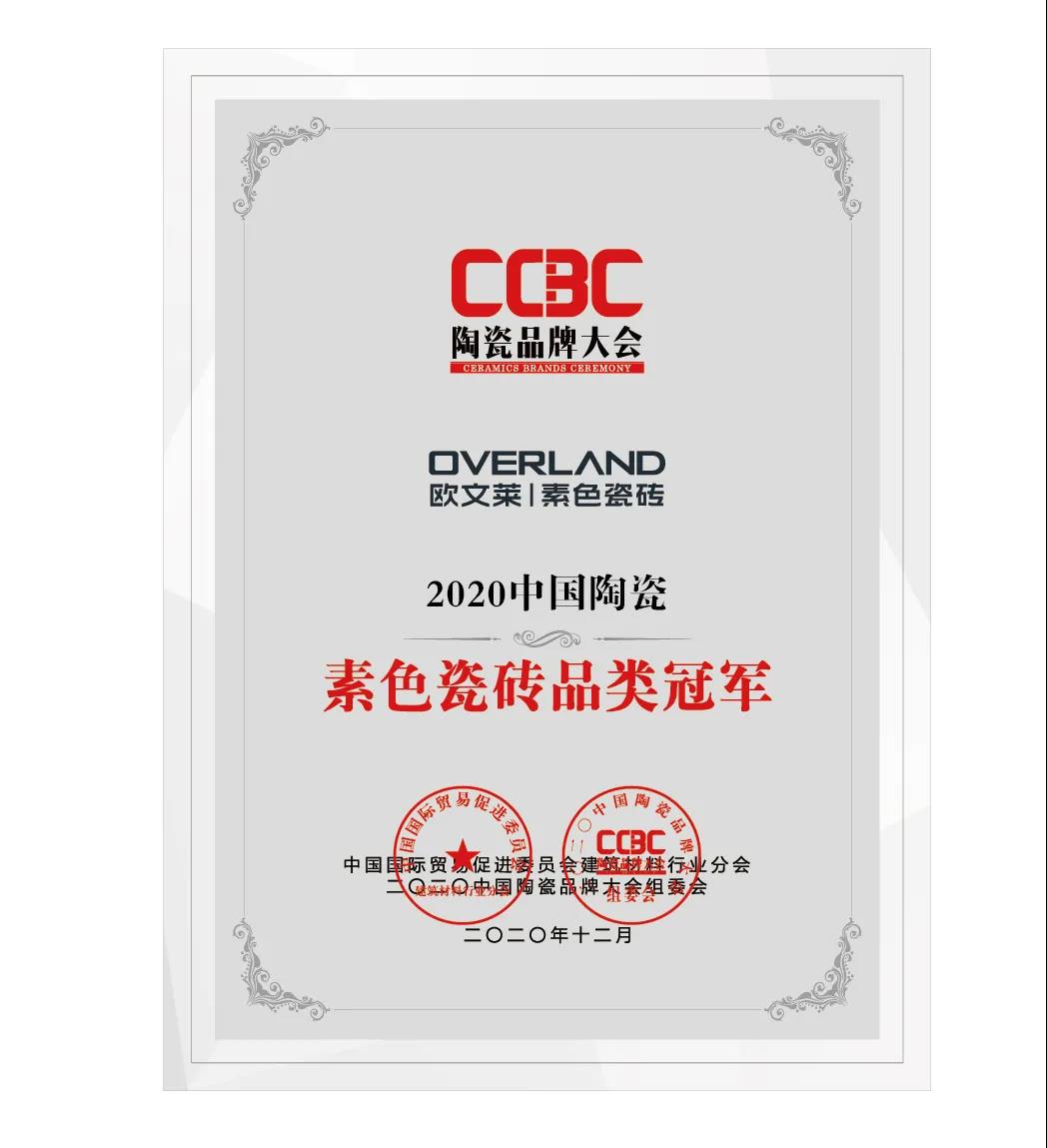 欧文莱荣誉再加冕,荣获“2020中国陶瓷素色瓷砖品类冠军”,绽放品牌领军之光。