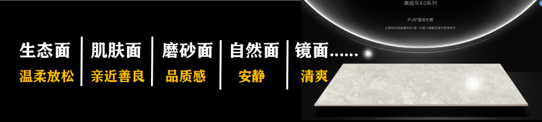 从触感空间上去了解瓷砖,以欧文莱的产品体系为例,目前形成了多种表面的设计表达,且每个细节都在触发人的“颅内高潮”的愉悦性,诸如生态复合面带来的温柔放松、肌肤面的亲近善良、磨砂面的高端品质感、自然面的安静与镜面的清爽...... 这些都是跨界知识的产品合体。